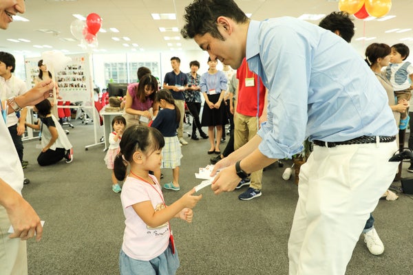 メンバーの名刺がこども縁日で提供しているゲームの参加券になるようにして、コミュニケーションの活性化を図りました。子ども縁日ではだるま落としやスーパーボールすくいといったブースをご用意。