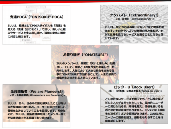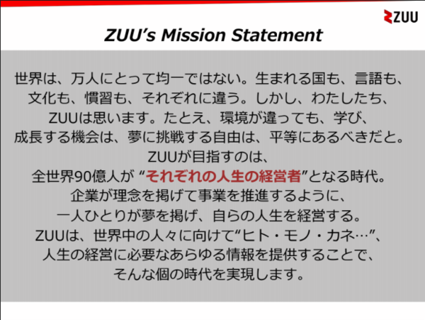それからZUUのミッションステートメント・バリューの話に続きます。