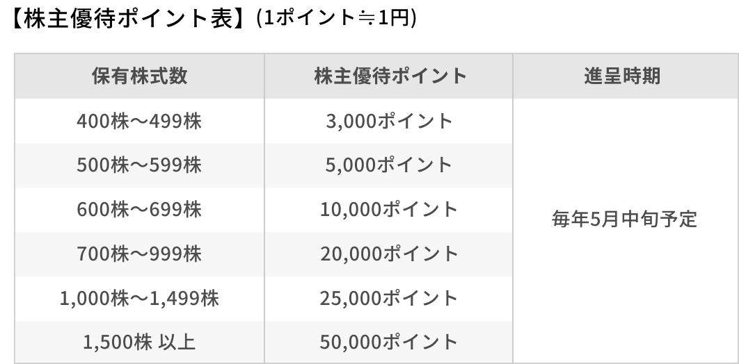 対象となる株主様に対し、以下の【株主優待ポイント表】に基づいて、株主優待ポイントを進呈します。株主優待ポイントは、株主様専用WEBサイト「ZUU・プレミアム優待倶楽部」において、食品、 電化製品、及び体験ギフトなど5,000種類以上の商品からポイント数に応じて交換可能です。