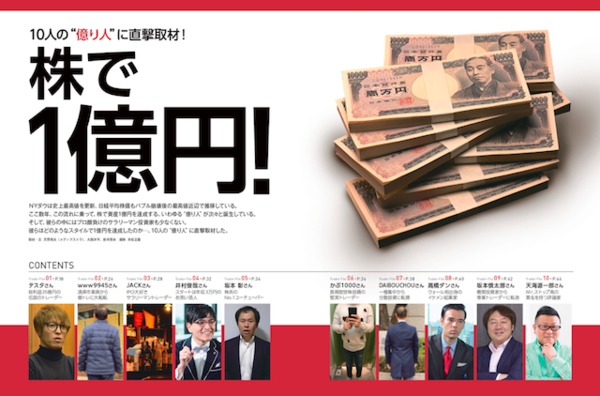 NYダウは史上最高値を更新、日経平均株価も29年ぶりの高水準で推移しています。 ここ数年、この流れに乗って、株で資産1億円を達成する、いわゆる“億り人”が次々と誕生しています。 そして、彼らの中にはプロ顔負けのサラリーマン投資家も少なくありません。 彼らはどのような投資スタイルで1億円を達成したのでしょうか?10人の“億り人”に直撃取材し、彼らの投資哲学や投資手法に加えて、2020年の注目株をうかがいました。