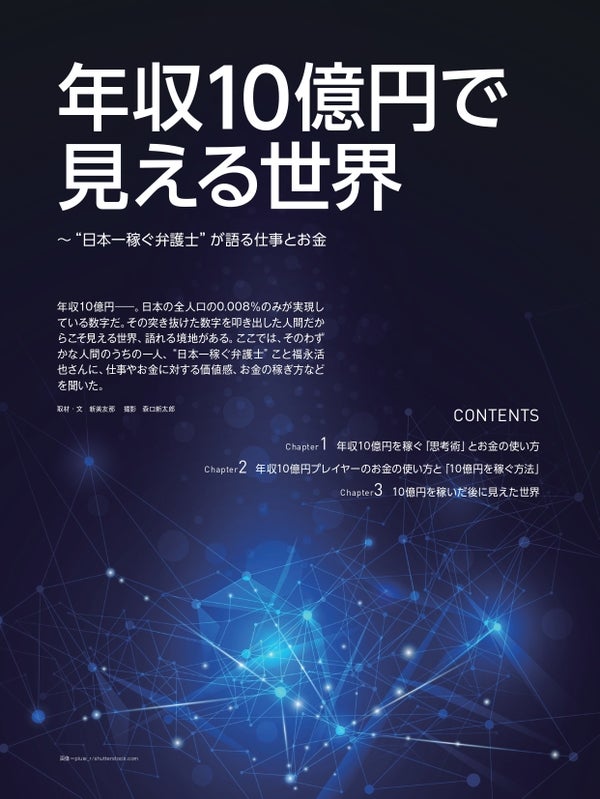 年収10億円ーー。日本の全人口の0.008%のみが実現している数字だそうです。その突き抜けた数字を叩き出した人間だからこそ見える世界、語れる境地があるに違いありません。ここでは、そのわずかな人間のうちの一人、“日本一稼ぐ弁護士”こと福永活也さんに、仕事やお金に対する価値観、お金の稼ぎ方などを取材しました。