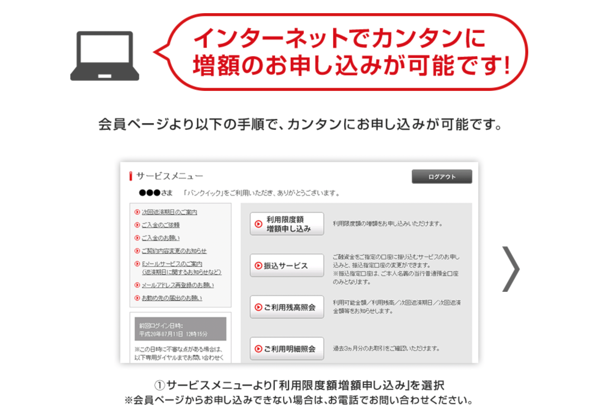 バンクイックの増額申し込みは、インターネットで手続き可能です。