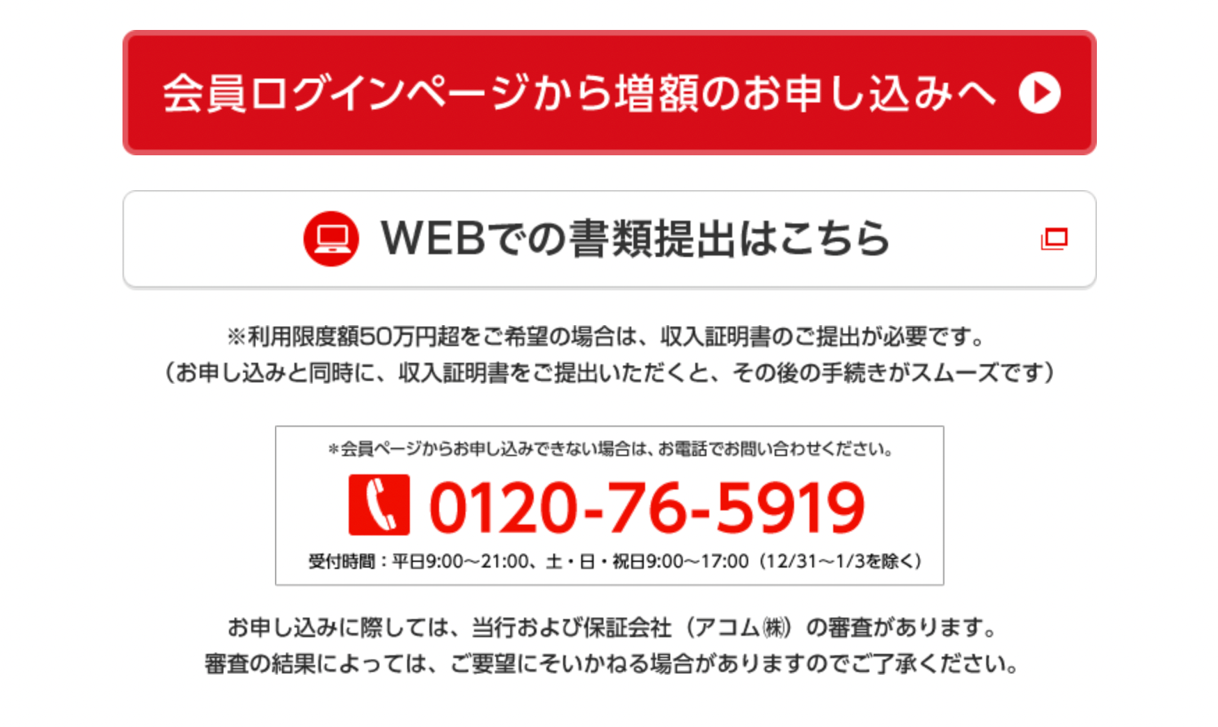 利用限度額を50万円超増額したい場合、収入証明書類の提出も必要です。収入証明書類は、給与所得者は源泉徴収票、自営業者やフリーランスなら確定申告書類や納税証明書などが該当します。申し込む前に準備しておきましょう。会員ページから申し込む際には書類を撮影して、その画像をアップロードして提出します。