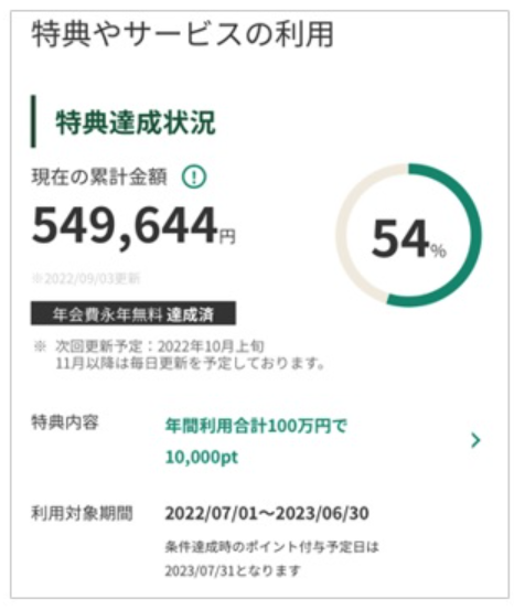 - 本会員カード加入月の11ヵ月後末までを利用対象期間として、100万円利用することで翌年以降の年会費が永年無料※となります。