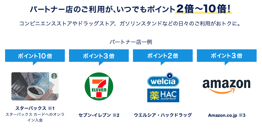 ・Yahoo!ショッピングで5% | ・楽天市場で最大16倍! | ・ポイントをマイルに変換できる | ・誕生日月はポイント3倍 ・利用金額が増えるほどお得に |