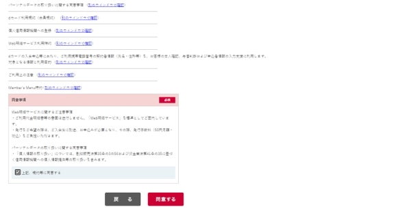 内容を確認したうえで問題なければ、同意事項を確認して「上記、規約等に同意する」にチェックを入れましょう。