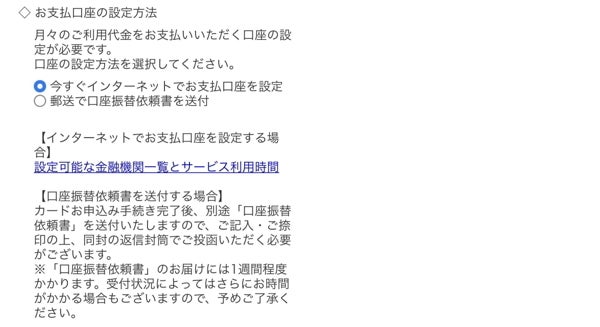次にお支払い口座の設定方法を選びます。指定方法は「今すぐインターネットでお支払口座を設定」または「郵送で口座振替依頼書を送付」のいずれかから選ぶことができます。