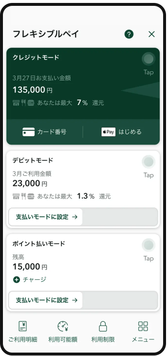 クレジットモードで支払った金額や今の資産状況を確認したいときは、アプリを開けばすぐに分かるので便利です。複数のアプリを開く必要がないため、手間もかかりません。