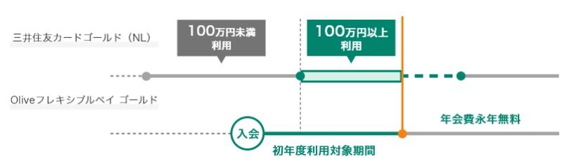 また、両者とも年間100万円の利用で年会費が無料になるサービスを実施していますが、三井住友カード(NL)からOliveフレキシブルペイ ゴールドに乗り換えた場合、それまでの利用額の実績が引き継がれます。