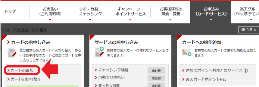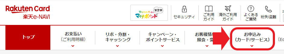 具体的な手順は、楽天E-naviにログインしてください。ログイン後、右上にある「お申込み(カード/サービス)」にカーソルを当てます。