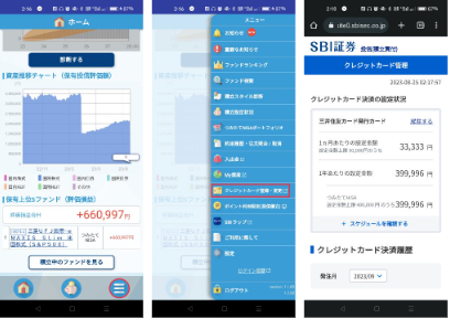 SBI証券は、「かんたん積立 アプリ(投信積立専用アプリ)」または公式サイトでカードを登録するだけで積立投資が可能です。
