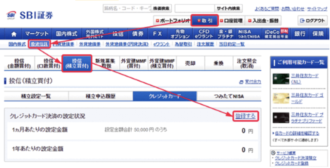 ログイン後、「取引」「投資信託」「投信(積立買付)」「クレジットカード」の順に選択し、「登録する」をクリックすると登録できます。
