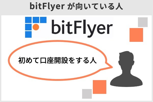 bitFlyer(ビットフライヤー)が向いている人は初めて口座開設をする人だ。取扱通貨数は38種類あり、レバレッジ取引ができるなど口座を開設しておけば幅広い投資ができる。