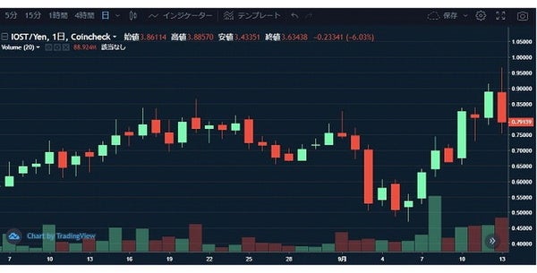 2020年9月8日にCoincheckが国内で初めてIOSTを上場させた。上の画像はその時期の値動きである。5日は終値が0.50862円に落ち着いていたが、翌日から上昇を開始した。最終的に12日には0.88838円にまで上昇している。上げ幅は5日の1.7倍だ。