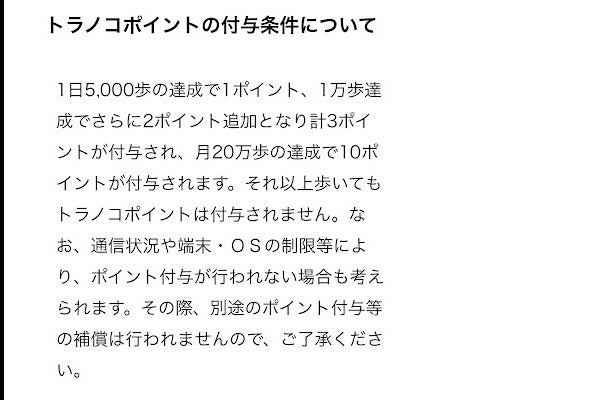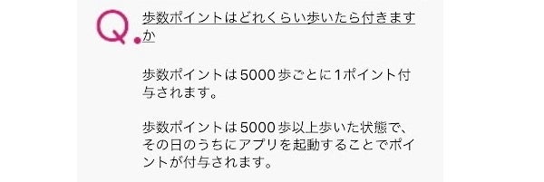 歩き続けるだけで、ポイントが貯まるシステムです。ポイントは5,000歩あたり1ポイントと獲得までのハードルが少し高めです。