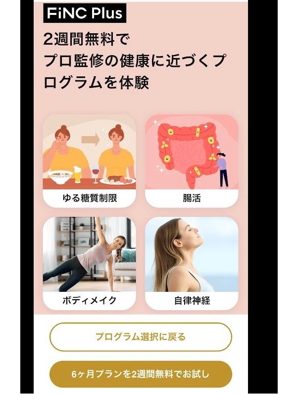 登録時にプログラムを選択することで、AIのサポートを受けながらキレイな身体づくりをサポートしてくれます。プログラムは、2週間無料で体験できるため気軽に始められます。