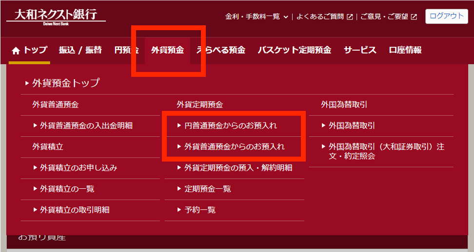 外貨定期預金の申込みも簡単です。大和ネクスト銀行の取引サイトの「外貨預金」メニューから、「円普通預金からのお預入れ」または「外貨普通預金からのお預入れ」を選び、画面に従って申込内容を入力すれば取引できます。