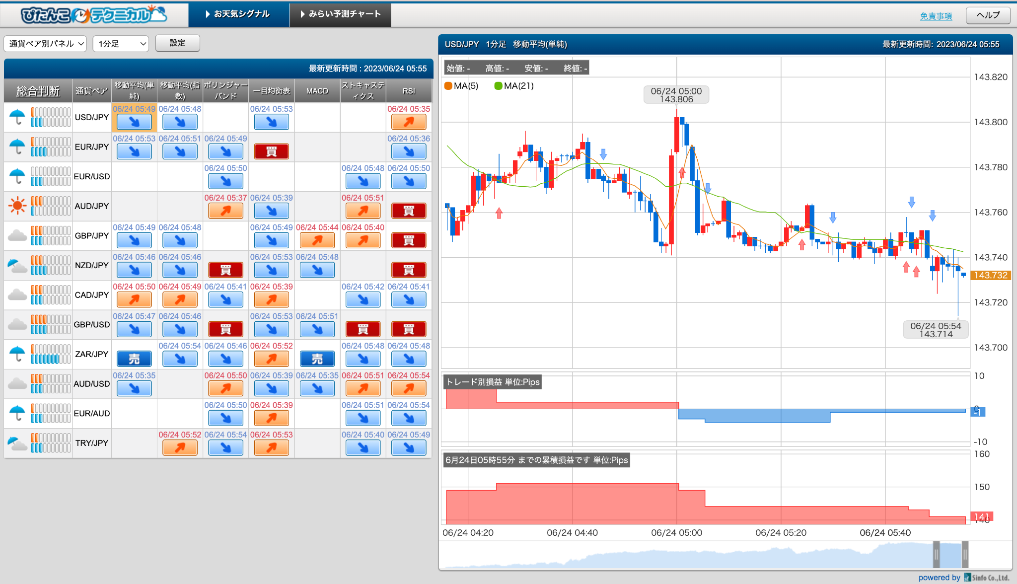 オプトレ!の弱点は、取引画面にテクニカル分析機能がない点です。分析を行う場合は、GMO外貨のFX用ツール「Exチャート」に移動する必要があります。「Exチャート」では全36種類の豊富な指標が使えるほか、最大6画面を分割して複数の通貨ペアを同時に分析できます。FX用の画面に移動する手間が気にならない方なら、むしろ高機能な分析環境を活用できるでしょう。
