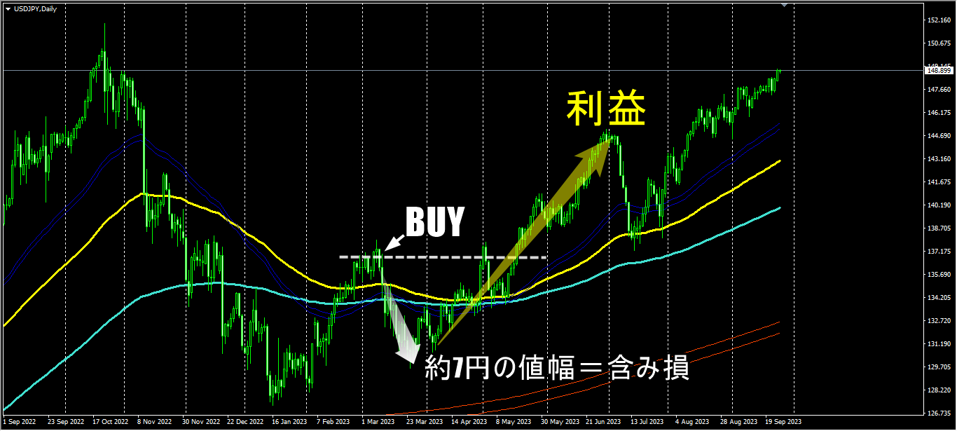 例えば、取引をした価格から逆行してもある程度の含み損に耐えて利益になるのを待つ余力が生まれます。