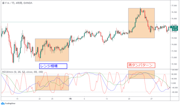 たとえば、トレンドが出ていないレンジ相場でもRCIやストキャスティクスのラインは上下にうねりますよね。でもRCIだと中期や長期の線が真ん中あたりで方向感なくさまようので、一目でレンジ相場だとわかります。