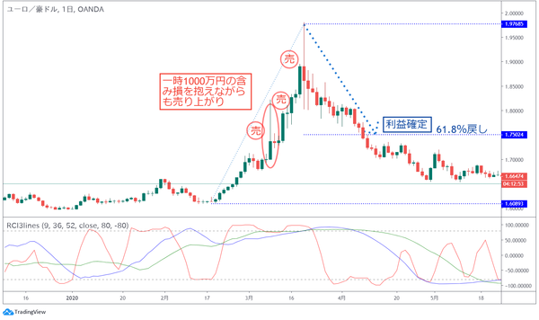 一度ポジションを整理して、上昇したところで売り直すということもしました。その結果、最初に売りを入れてから10日目にピークから半値まで下落。この勢いならば61.8%戻しまで行けると踏んで、売り持ちした結果、1トレードで2000万円稼ぐことができました。