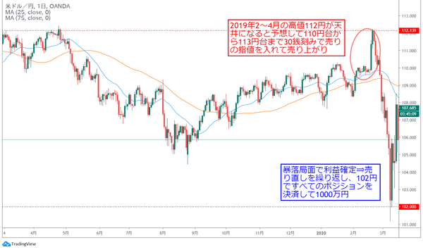 コロナショックでアナリストが「100円割れの可能性も!」なんて言い出したところで、「これは底打ちサインだな」と判断して、すべてのポジションを102円台で決済。10円幅を抜いて、1000万円近く稼ぐことができました。