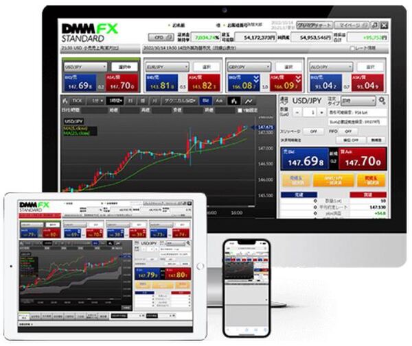 さらに、DMM FXの取引ツールは、パソコン、タブレット、スマホなど幅広い機器で使用できるよう設計されています。具体的には、PC用の高機能取引ツールとして「DMMFX PLUS」が、パソコン、タブレット、スマホで使えるスタンダードな「DMMFX STANDARD」、スマホアプリの「DMM FX」などが用意されています。