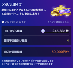 「TIPSTAR」は、各期間に応じて「メダル山分け」「メダル抽選」「メダルランキング」といった主に3種類のメダルイベントが実施され、それぞれ条件を達成することで、TIPマネー報酬を獲得できるようになっています。