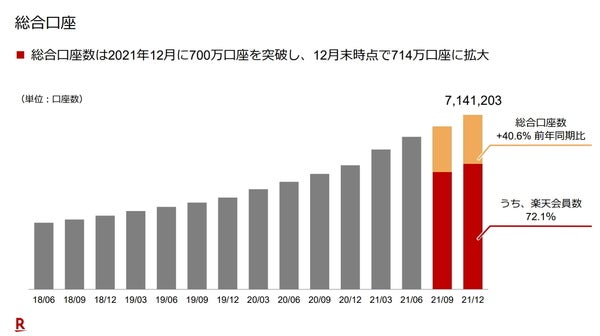 おかげさまで前の年に続いて新規口座の獲得が順調で、口座数は2021年12月末時点で前年比約4割増の714万口座となりました。預かり残高も54%増えて、過去最高の15.3兆円に達しています。個人の売買代金シェアも2.1ポイント増えて業界第2位の29%と、いずれも予想以上の伸びでしたね。