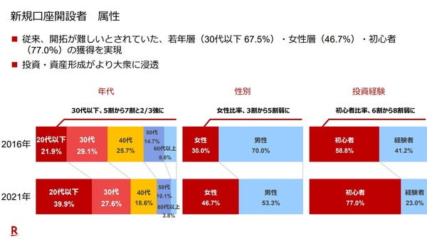 ――新規口座開設者の内訳を見ると、初心者、とりわけ30代以下の若年層や女性の比率が多いですね。