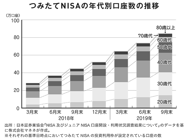これを見れば分かるとおり、30代と40代が利用者の半数を占めるなど、幅広い年代で「つみたてNISA」という非課税制度を活用する人が急速に増えていることがわかります。中でも伸び率が一番高いのは20代。若い年代の人たちも将来の資産形成のためにこの制度を活用し始めているということです。