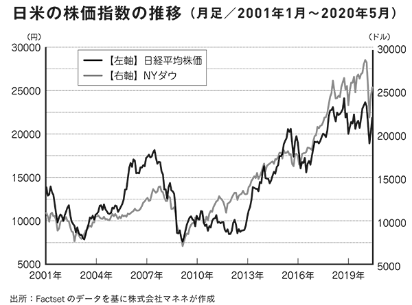 上の図は、ここ20年間の日経平均株価とNYダウ推移になります。ジワジワと右肩上がりになっています。将来のことは誰にもわかりませんが、少なくともこの20年間に限っていえば日米ともに株価指数は右肩上がりのトレンドで、時間をかけて投資を続けていた人は、かなりの運用成績を収めたことでしょう。