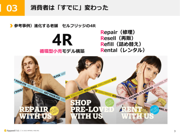 例えば消費者意識の変化のなかで「サステナブル志向」は、どんどん強くなっている傾向です。1909年創業のセルフリッジというロンドンのデパートは、世界中のラグジュアリーブランドが店舗を出したいと思うような店ですが、「2030年までに売上の50%は物販以外のサービスから獲得する」と宣言しました。なぜならセルフリッジは「4R」という施策を打ち出したからです。