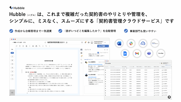 まず、弊社のサービスは、契約書管理のクラウドサービスになります。2020年のコロナ禍以降、電子契約サービスの利用率は格段に上がりました。そして、電子契約サービスを多くの企業が展開しています。Hubbleは、これらのサービスから送られてくる契約書や依然残る紙の契約書を集約する役割を担っているところが特徴です。他サービスとの違いは、具体的には、契約書の変更履歴や締結プロセスの管理も行えるのが特徴で、締結後の契約書だけではない情報を一元的に管理できるところがHubbleの強みです。