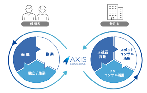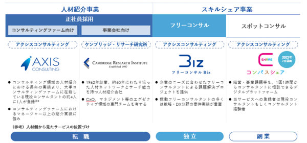 「アクシスコンサルティング」に関しては、大手コンサルティングファームに在籍するコンサルタントの4人に1人が登録する人材データベースを保有している点と登録人材と中長期的な関係性を構築していることが強みです。通常、登録されている候補者とのコンタクトは平均3~4ヵ月ですが、弊社の場合は中長期で伴走しながら支援を継続します。例えば過去3年間の決定者実績の約半数は、1年以上フォローしています。またDXやハイエンドのコンサルの領域において、正社員の紹介とスキルシェア事業の複合型ソリューションを提供しているのは、業界内で弊社だけです。これも大きな差別化要因でしょう。