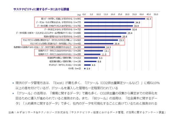 求められてはいるものの、7割の企業様が「企業価値の向上に活かしきれていない」とコメントされています。活かされていない背景として、管理すべき項目が多岐にわたるため、データ収集自体がなかなかできていないことや、グループの中のどこにデータがあるのか把握できていないという問題が挙げられます。また、昨今注目されている人的資本開示においても同様に、データ収集や可視化の基盤整備に課題があります。