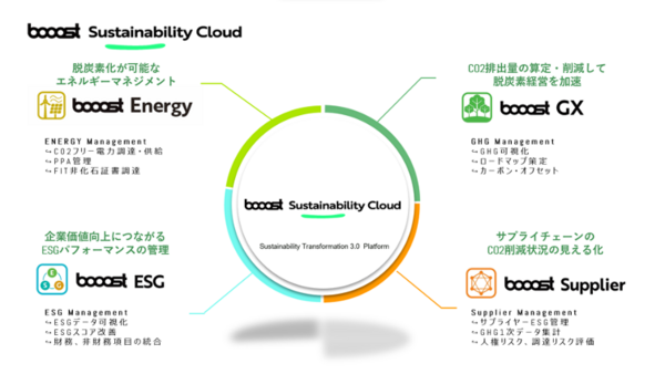 サステナビリティ経営を加速するためのプラットフォーム「booost Sustainability Cloud」を提供おり、4つの構成アプリケーション、CO2排出量の見える化・カーボンオフセット・報告レポート等のGXを促進する「booost GX(旧ENERGY X GREEN)」、サプライチェーン全体のCO2排出量の見える化を実現する「booost Supplier」、ESGの開示項目を見える化しESGパフォーマンス向上につなげる「booost ESG」、 CO2フリー電力等の調達や供給を可能とする「booost Energy(旧ENERGY X)」を展開しています。コンサルティングサービスと合わせてNET-ZERO/ESGリーダーのSXを支援しています。