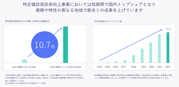 2018年4月には、特定健診受診率向上事業の全国シェアが10%を突破。2021年度における予防医療事業を支援した全国の自治体の数は、1,716自治体中684(約40%)を達成。ヘルスデータの分析をした年間人数は約979万人、そのうち予防医療の行動変容を支援した年間人数は約601万人にのぼる。