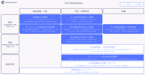 他にも弊社が培ってきた行動変容のノウハウを活かし、大学や国立研究開発法人など研究機関の調査研究や介入研究をサポートする「調査研究事業」。ヘルスビッグデータを用いた疫学的な手法で地域診断を行い、健康寿命延伸や医療費適正化の観点から取り組むべき健康課題を明確にする「医療費分析事業」。自治体と弊社が持つ行動変容のノウハウや民間の健康関連企業とのコラボレーションにより実現する健康のオープンイノベーションを通じて予防医療や疾患の早期発見・早期治療の普及を目指す「コンソーシアム型疾病啓発事業」も行っています。