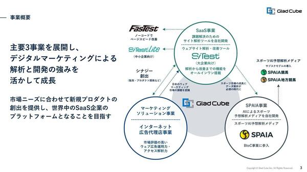 株式会社グラッドキューブ代表取締役CEO・金島氏(以下、社名・氏名略):弊社は「データ×解析の力でSaaS企業として世界中のプラットフォームとなる」のビジョンを掲げ、2022年現在は3つの事業を展開しています。