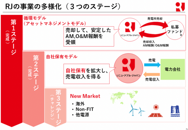 弊社は第1~第3までの3つのステージで事業の多様化を図っています。 第1ステージの循環モデル(アセットマネジメントモデル)と第2ステージの自社保有モデルは完成し、現在は第3ステージである、海外事業やFIT制度に依存しないNon-FITビジネス、風力や水力などの他電源開発に挑戦しています。