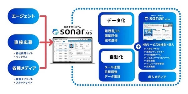 2つ目は、HRサービスの検討・導入支援サービスの「sonar store」です。これは求人媒体、適性検査、オンライン面接など、store ATSと連携するツールを購入できるHRサービスに特化したマーケットプレイスで、「sonar ATS」の中に格納されています。採用活動において当初の計画より応募者が少ない、内定を出しても競合に取られるといった課題を発見した時に、「sonar store」から外部のHRサービスを購入して対処できるなど、両者を組み合わせて使えるのが特長です。弊社は、このような「採用管理システム× HRサービスのマーケットプレイス」を手がける唯一の企業です。
