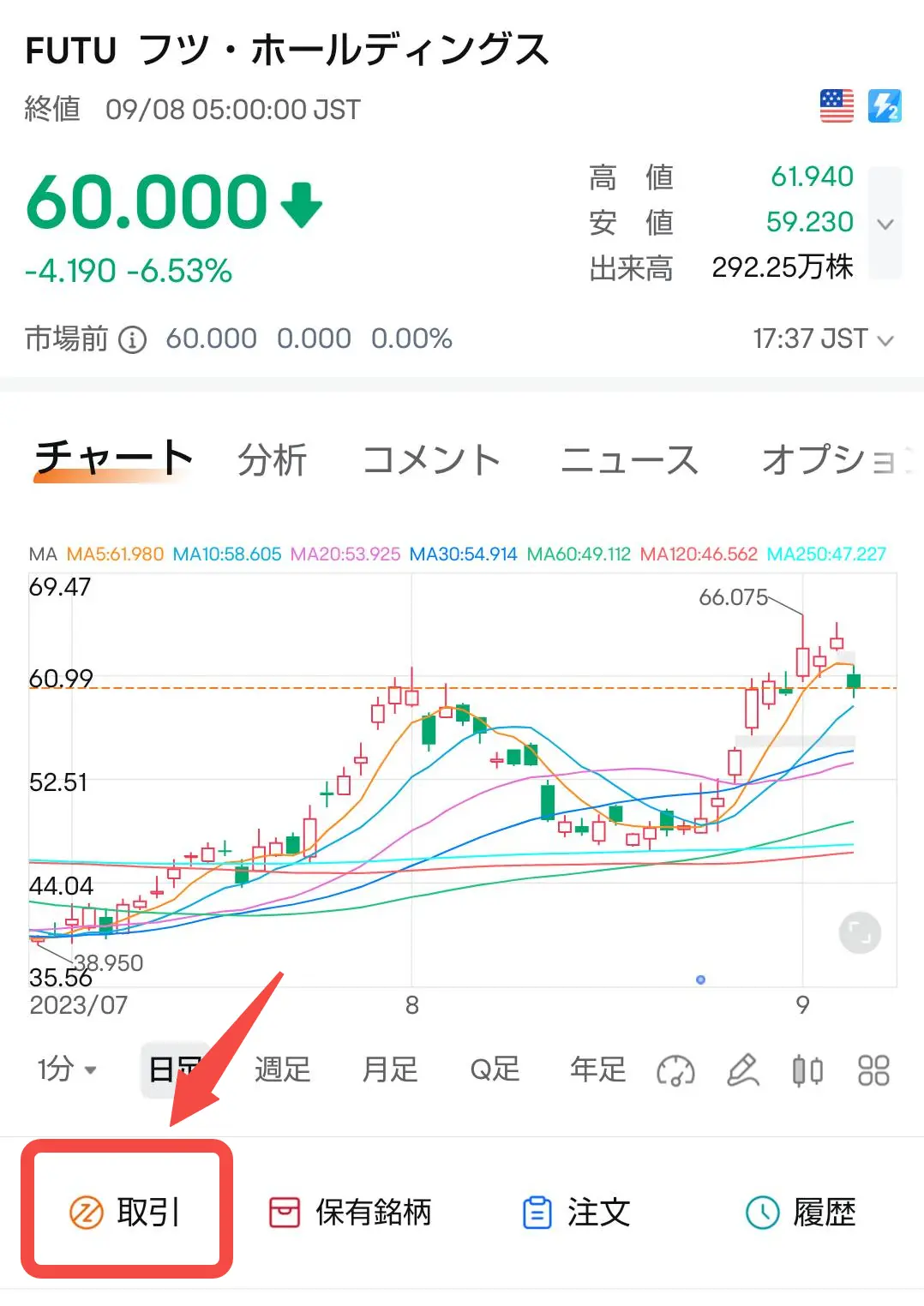 銘柄を検索してヒットしたら、その銘柄名をタップします。
