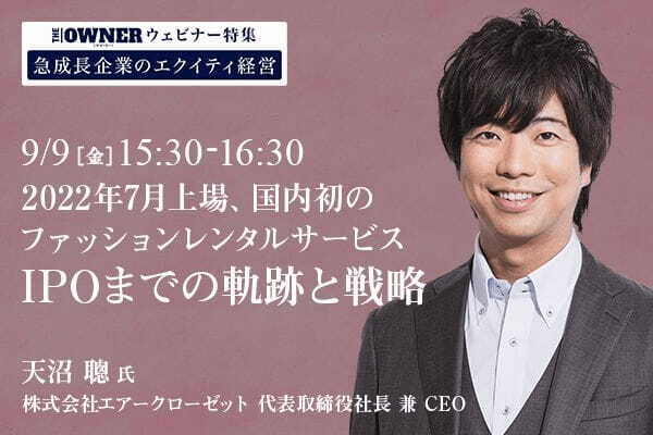 「急成長企業のエクイティ経営」特集第二弾は株式会社エアークローゼット 代表取締役社長 兼 CEOの天沼 聰氏がご登壇されます。エアークローゼットは月額制ファッションレンタルサービス『airCloset』を運営しており、会員数は70万人を突破しファッションサブスク業界をリードしています。2022年7月29日には東証グロース市場に上場しました。