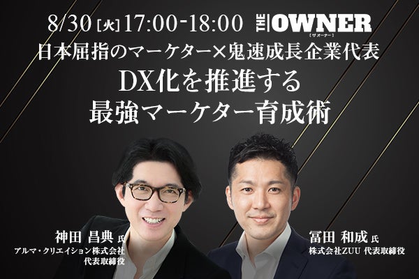 8月30日(火)17:00~18:00はアルマ・クリエイション株式会社代表取締役の神田 昌典氏と株式会社ZUU代表取締役の冨田 和成氏の特別対談を開催します。