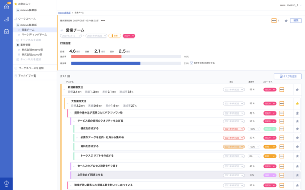 会議で会話された重要な課題、そして実行状況をチームで管理する機能があります。目標の進捗状況(KGIやKPI)、重点課題、施策の進捗状況など、全てが把握できるようになります。