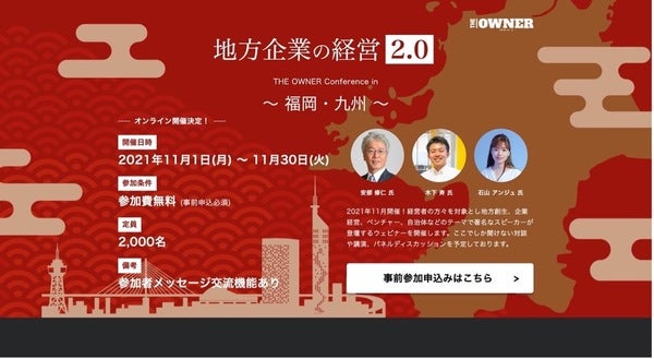 『THE OWNER(https://the-owner.jp/)』では2021年11月に、経営者様向けオンラインカンファレンスとして「地方企業の経営2.0 ~THE OWNER Conference in 福岡・九州~」を開催致します。