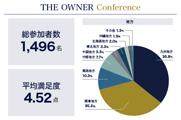 株式会社ZUU(代表取締役:冨田 和成)と株式会社日本M&Aセンター(代表:三宅 卓)の合弁会社ZUUM-Aが運営する経営者向けメディア『THE OWNER(ザ オーナー)』は2021年 11月1日~11月30日にオンラインカンファレンス「地方企業の経営2.0~THE OWNER Conference in 福岡・九州~」を開催し、総参加者数1,496名、平均満足度は4.52点(5点満点)となり、大盛況にて幕を閉じました。