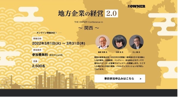 『THE OWNER(https://the-owner.jp/)』では2022年3月に、経営者様向けオンラインカンファレンスとして「地方企業の経営2.0 ~THE OWNER Conference in 関西~」を開催致します。