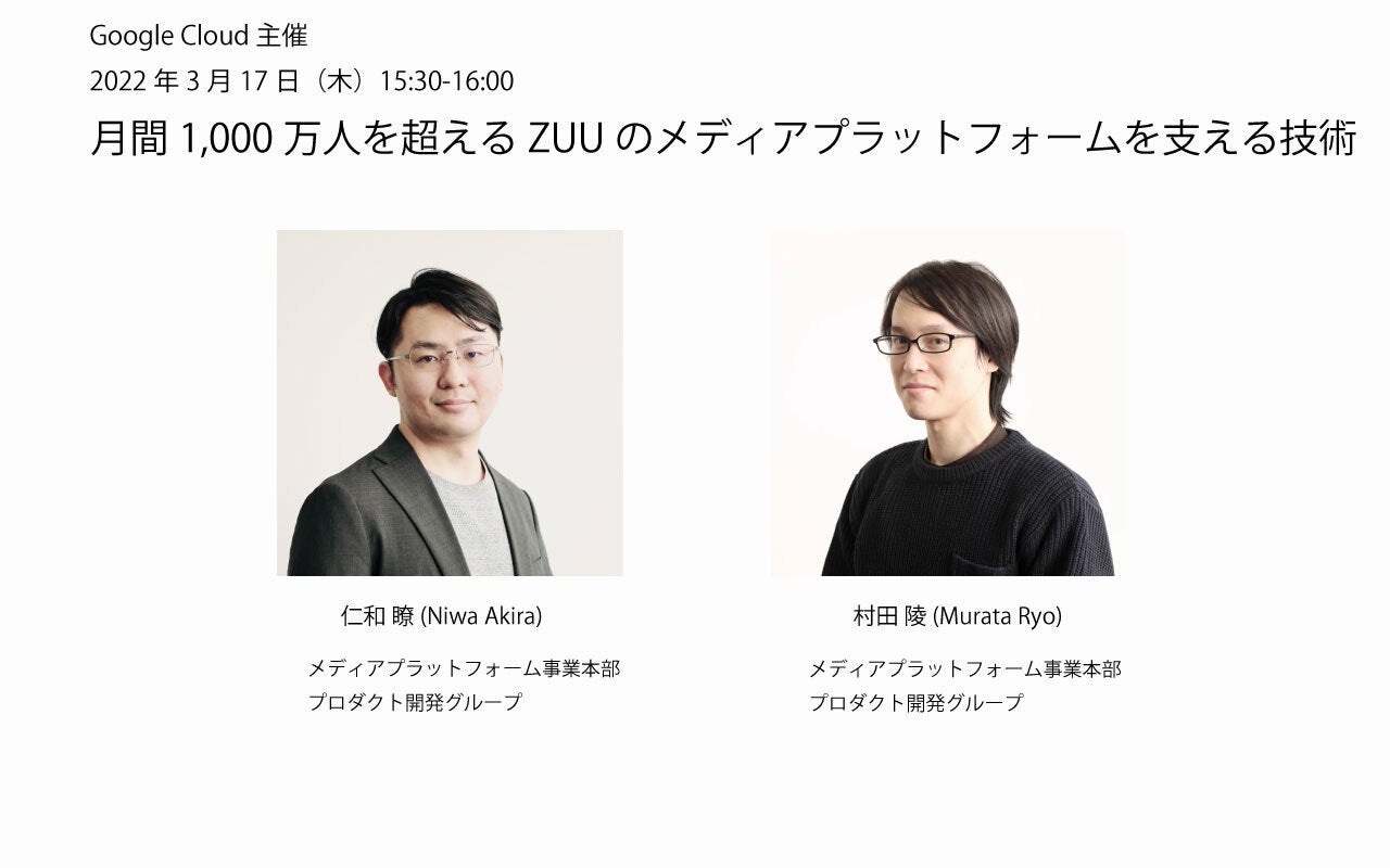 「月間1,000万人を超えるZUUのメディアプラットフォームを支える技術」と題しクラウドを活用しデジタルビジネスの成長を支援してきた知見などを弊社エンジニアの仁和と村田より共有させていただきます。
